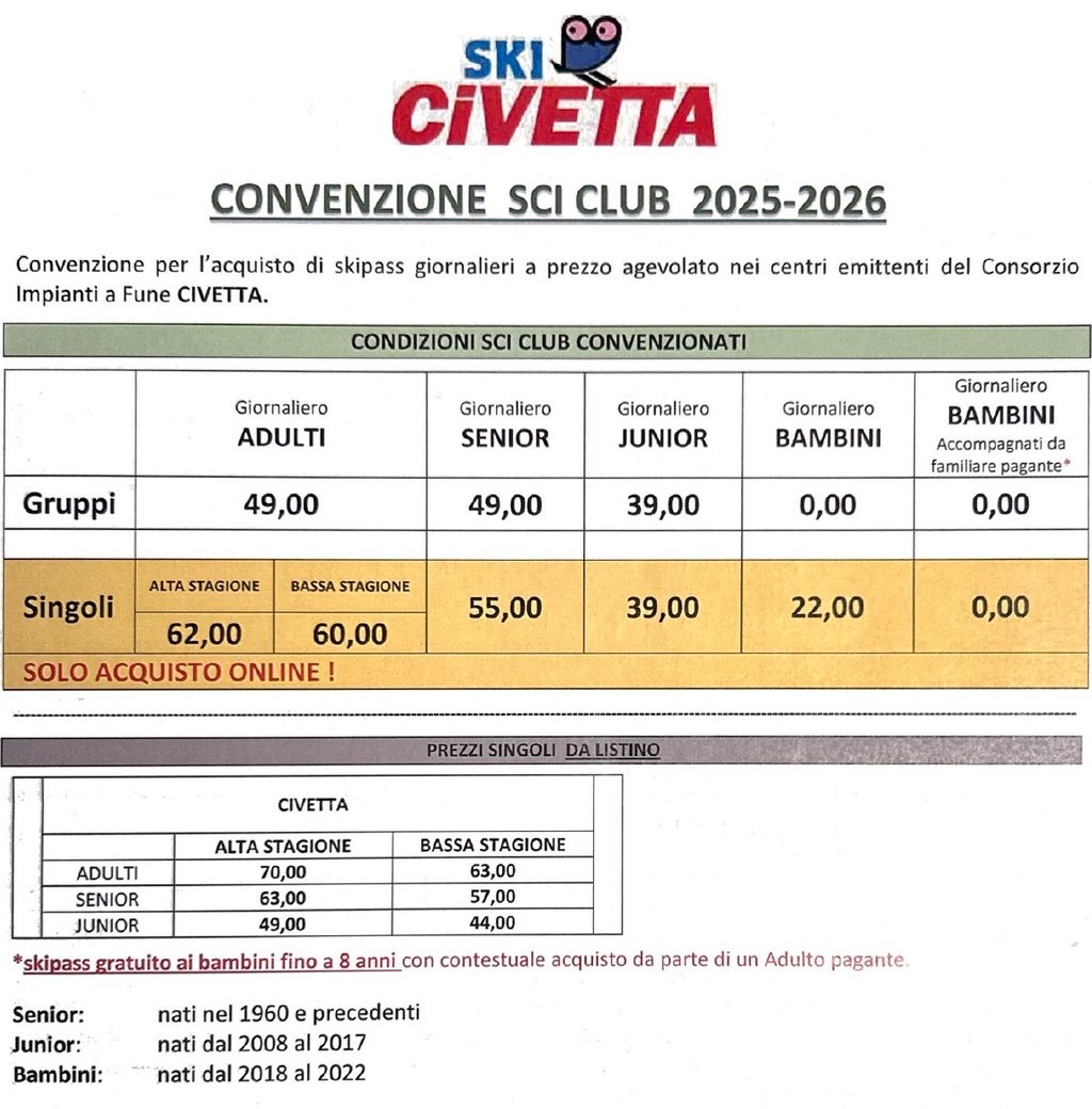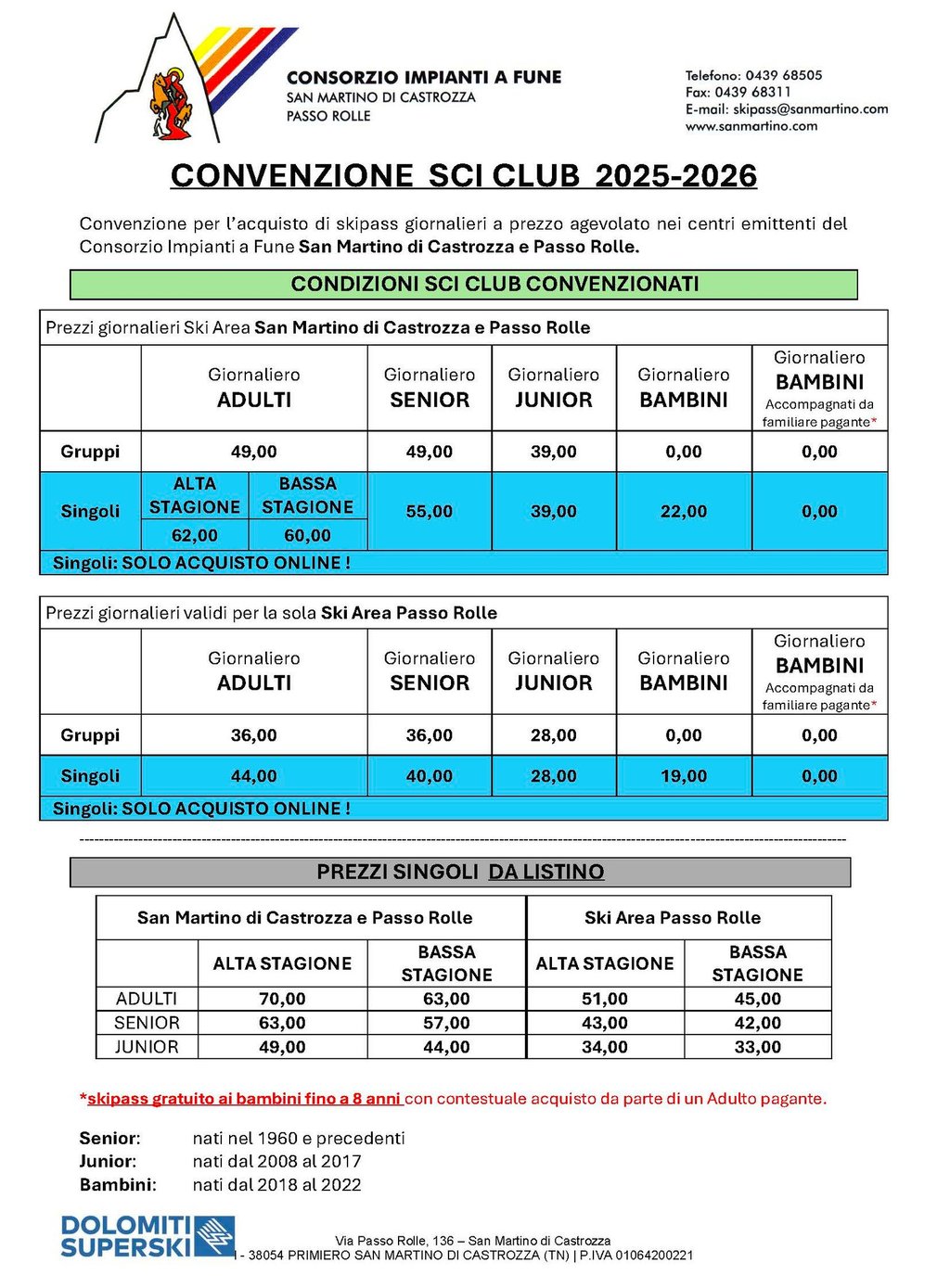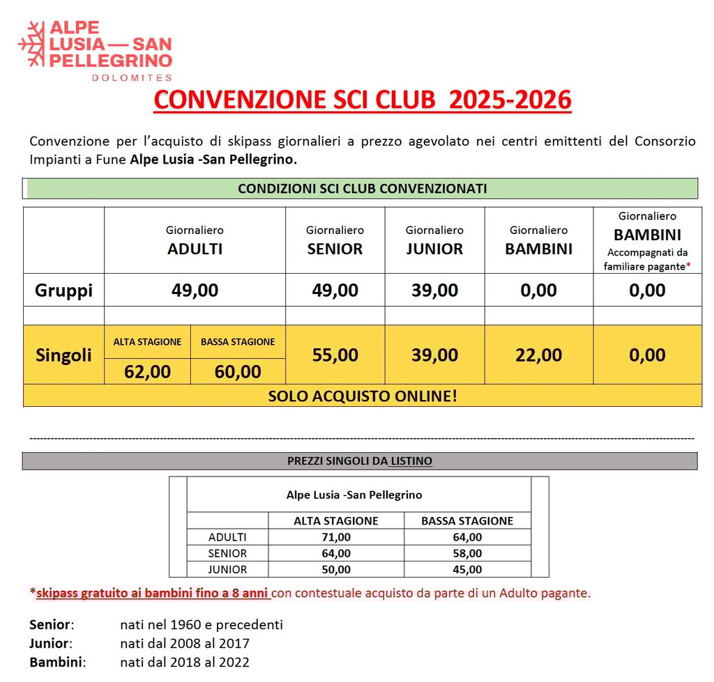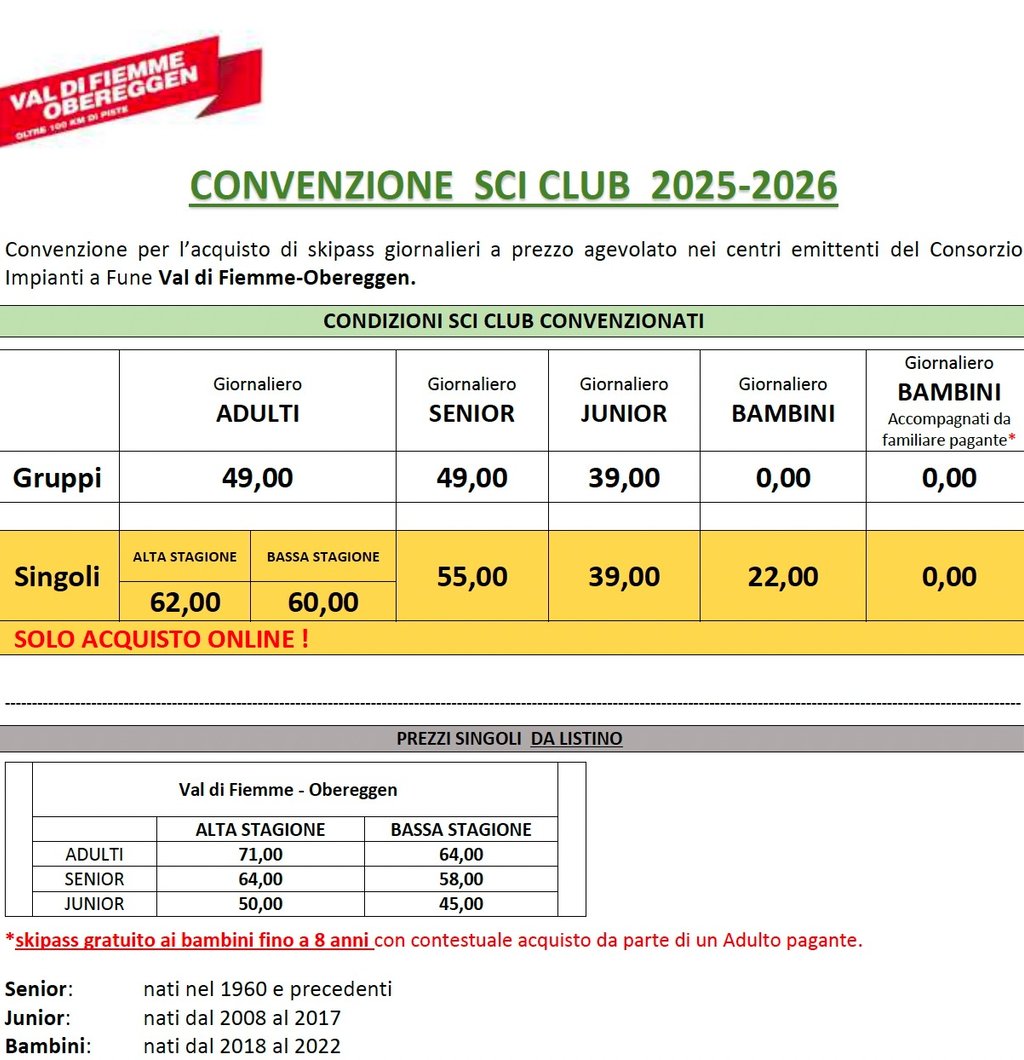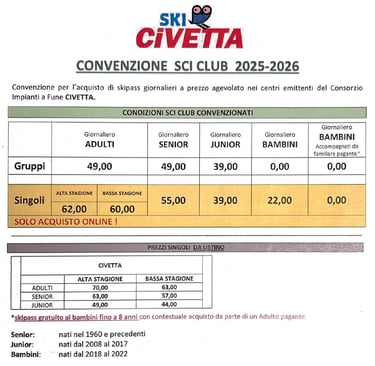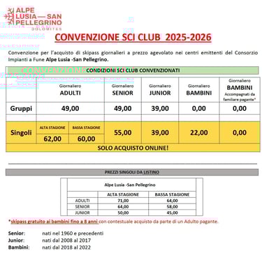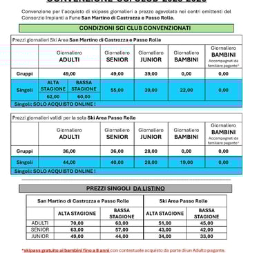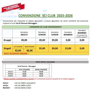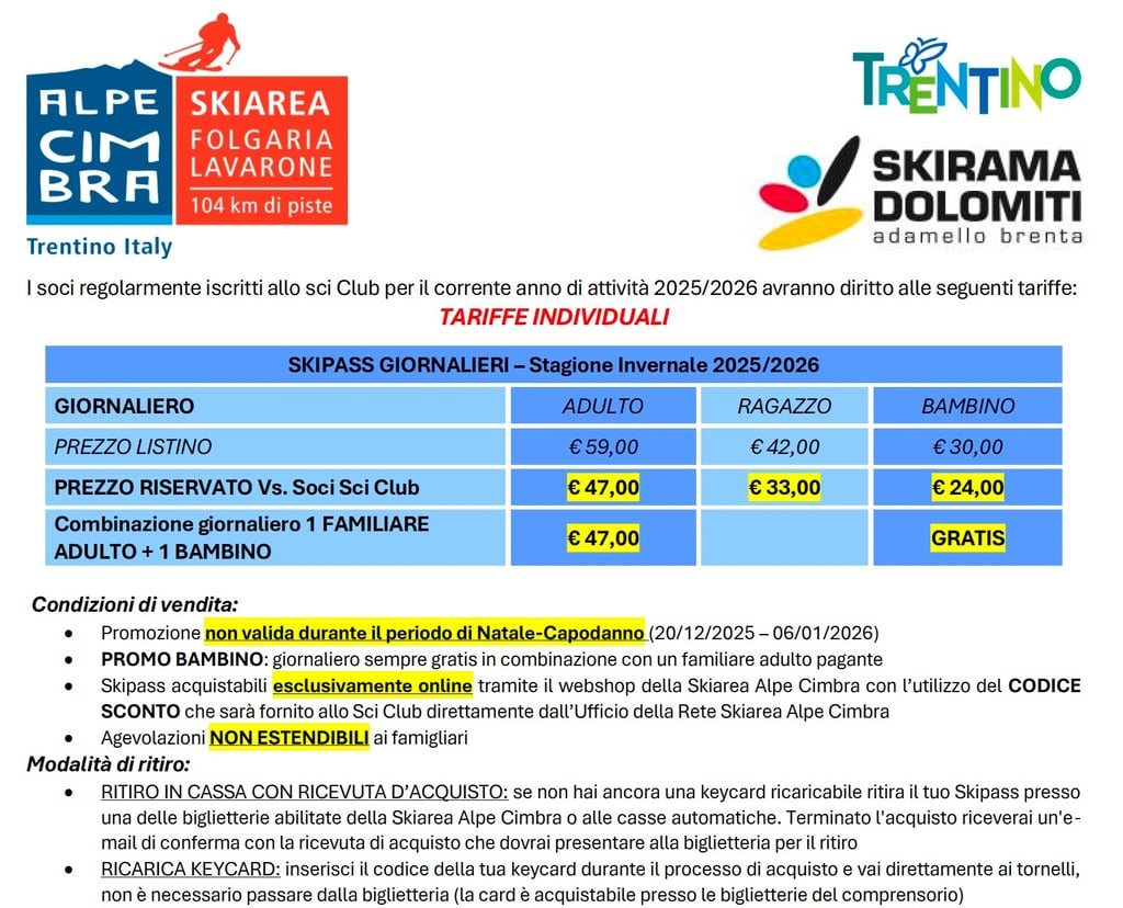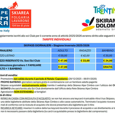 Durante la stagione invernale 2025-26, escluso i periodi di Natale – Capodanno (dal 20.12.2025 al 06.01.2026), e Carnevale (dal 14.02.2026 al 22.02.2026), per l’acquisto delle tessere - skipass GIORNALIERO Adulto del tipo FM (Folgarida Marilleva) o SK (SkiArea Campiglio Dolomiti di Brenta), sarà riconosciuto ai Vs. Soci, mediante codice sconto, che vengono inviati da FFM su richiesta di Sci Club/Cral/Associazione (da fare tramite mail entro una settimana prima dell’utilizzo), ed utilizzabile per l’acquisto solo esclusivamente online tramite il sito www.ski.it al link: https://folgaridamarilleva.skiperformance.com/ uno sconto del: